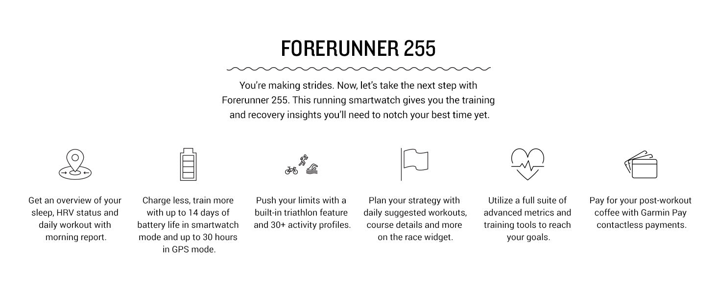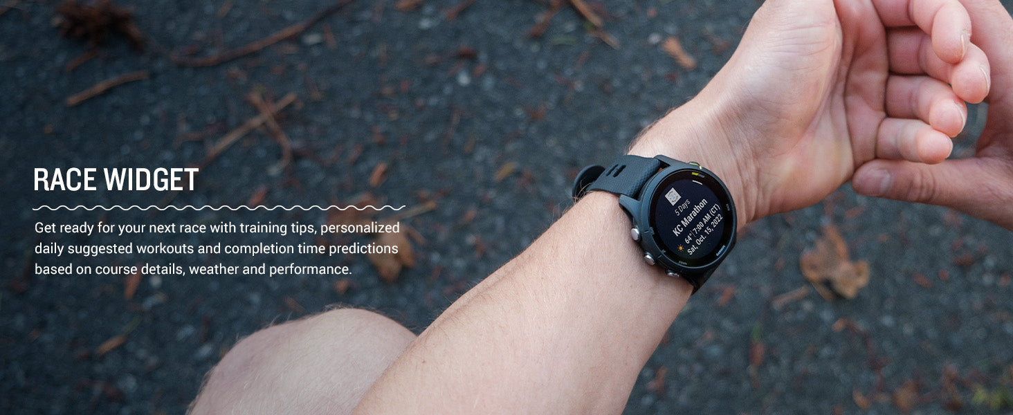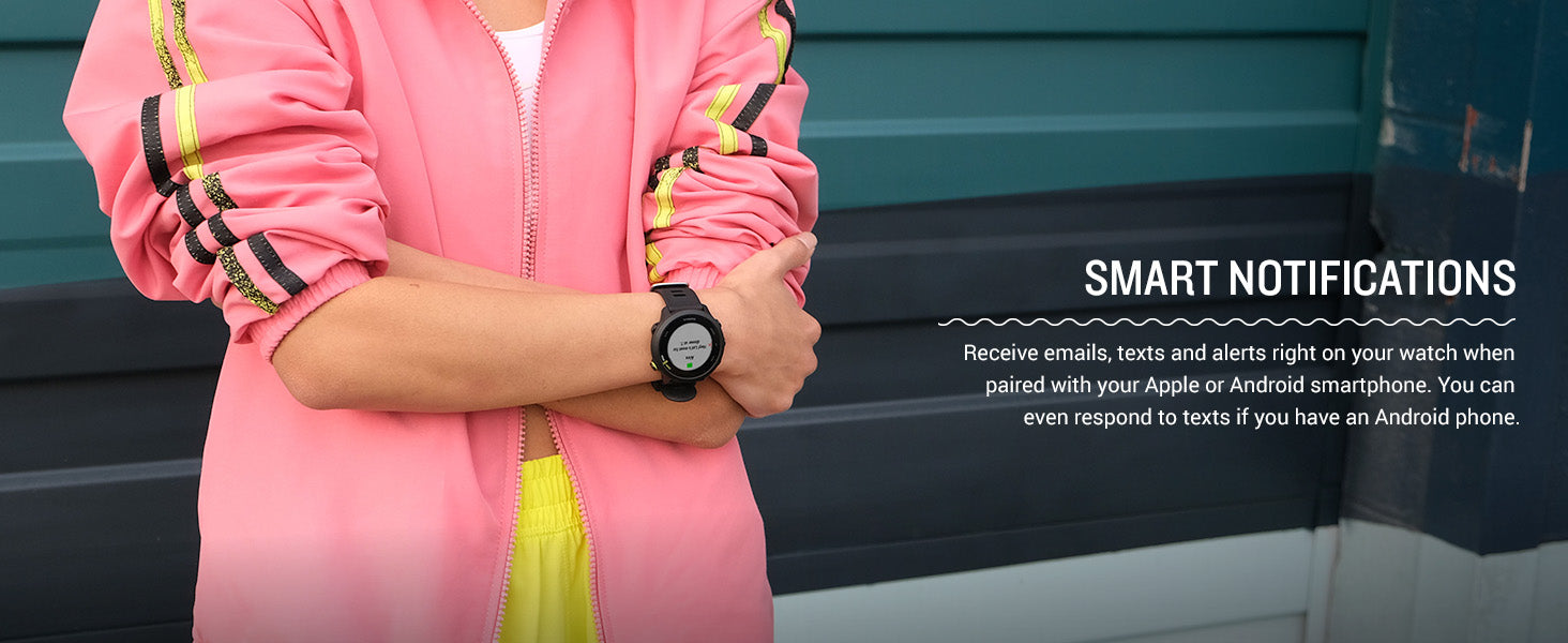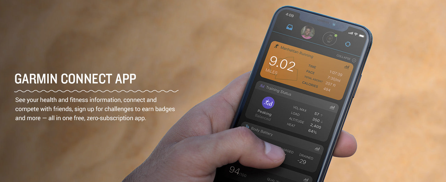 Smart Features: Smart notifications, text response/reject call with text (Android only), morning report, calendar, weather forecasts, Garmin Pay, Connect IQ compatibility (downloadable watch faces, data fields, widgets, and apps).